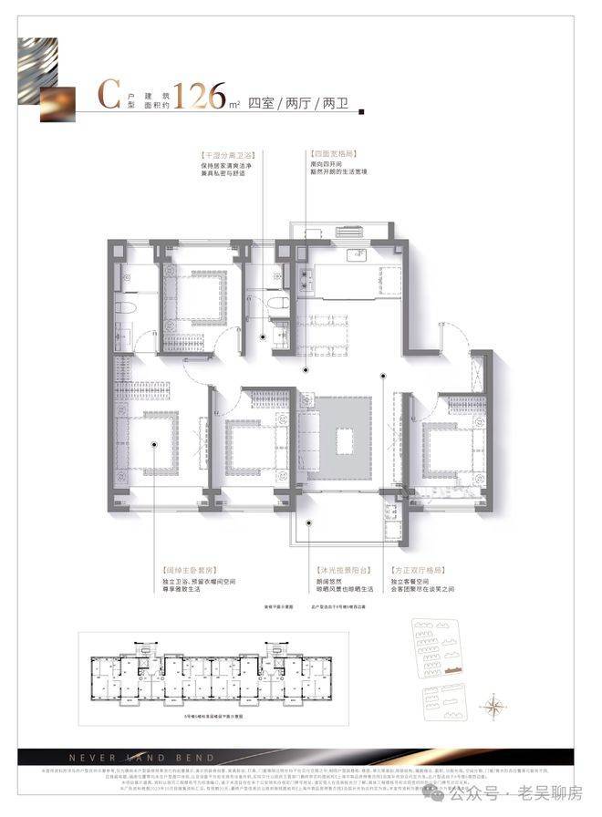 建面约126㎡真四房,进一步强化功能性,户型方正,四开间朝南,南北通透,南向卧室均带有大飘窗设计,拓宽了室内景观视野的同时,增加了实际空间使用率,有效避免面积浪费。