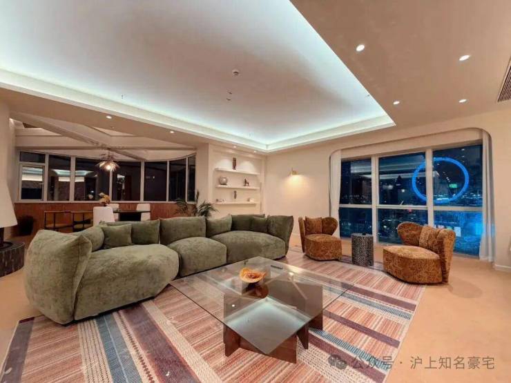 以暖调木质感、柔润的弧形线条(弧形沙发、圆柱壁炉)为基底,搭配复古色系(橄榄绿、酒红、焦糖棕)