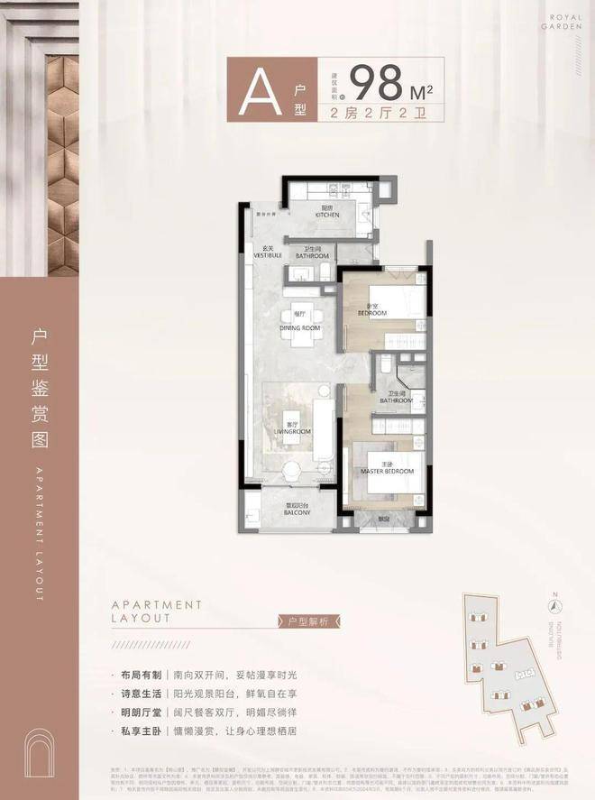 94-98㎡两房:双开间朝南,高得房率(75%-79%),适合年轻家庭或夫妇。45