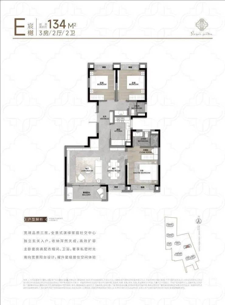 104㎡3户型特点:该户型多为楼栋的东边套,是一个观景户型。客厅连接270°阳台,视野出众。双卧朝南,阳光满溢。从次卫布局看,如果家庭人口较少,该户型还能做成双套卧。