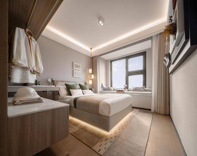 第四个亮点,是南向主卧套房设计,不仅能放得下2*1.8米双人床,且还能保留约1米的过道;同时带独立卫生间和大飘窗,增强私密性。
