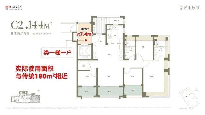 ②、144㎡户型本身实得面积约133㎡,加上专属电梯厅后,整体可用面积可达约141㎡,这一空间尺度已与市面上二手180㎡户型的可使用面积相近