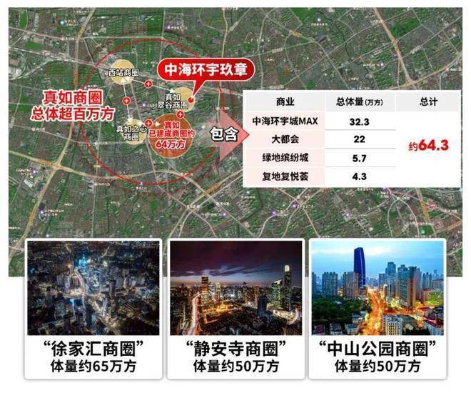 内环旁TOP级商圈,约64.3万方成熟商业集群,含约32万方顶流真如环宇城MAX(全市销售额前10的商业体)及市中心唯一山姆会员店。