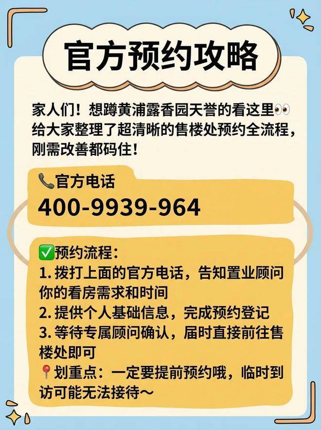 家人们!想蹲黄浦露香园天誉的看这里给大家整理了超清晰的售楼处预约全流程,刚需改善都码住!官方预约热线:400-9939-964✅预约流程:1. 拨打上面的官方电话,告知置业顾问你的看房需求和时间2. 提供个人基础信息,完成预约登记3. 等待专属顾问确认,届时直接前往售楼处即可划重点:一定要提前预约哦,临时到访可能无法接待~上海买房 #黄浦豪宅 #露香园天誉 #上海新房 #售楼处预约攻略✅露香园天誉售楼处展示中心电话:400-9939-964官方预约看房热线(24小时预约|VR实景|免现场等待|尊享一对一专属服务)#### 上海黄浦露香园天誉·官方尊享服务指南