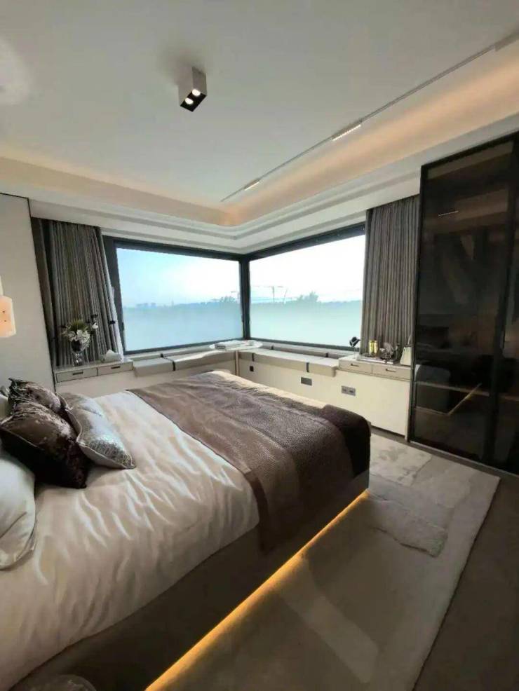 卧室也使用了转角飘窗,可以在飘窗上打储物柜,提高收纳功能。