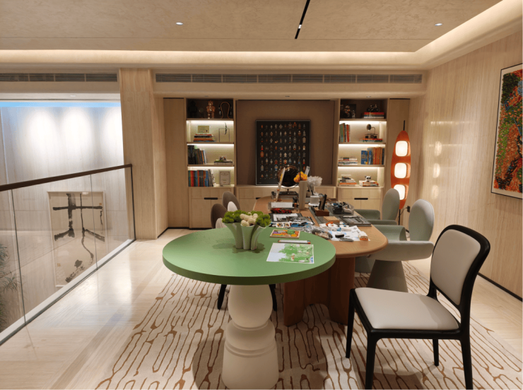 书吧:紧挨着下沉庭院,设计理念就是“把园子引进屋里”,绿城特邀出版人陈垦为书吧定制专属书单,精选《园冶》《繁花》等书籍,与社区山水意境相融,让书、景与生活自然呼应。