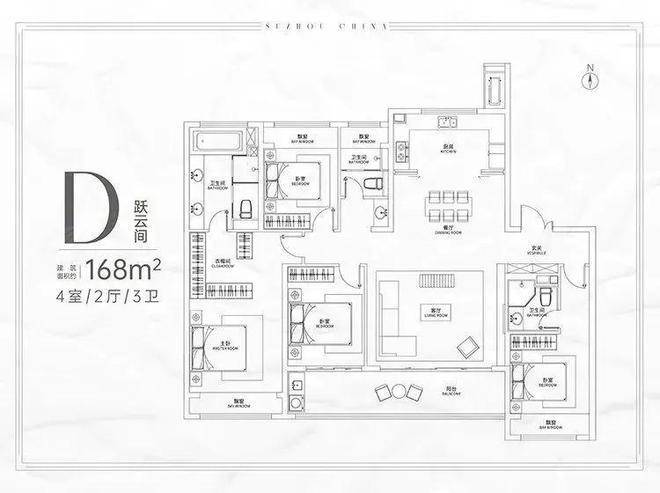 南向四开间,约5.1米大横厅,连接约8.1米阳台。主卧套房设计,带步入式衣帽间和明卫,6个飘窗设计。