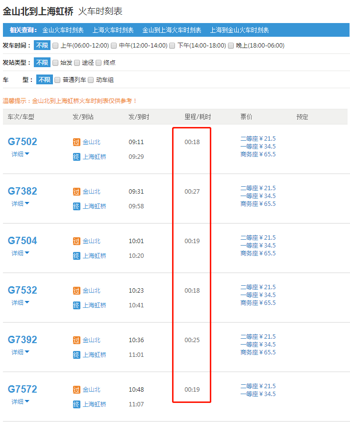 查询火车时刻表可以看到,金山北站到大虹桥核心枢纽只有1站,通勤时间远远低于十几站且站站停的地铁。