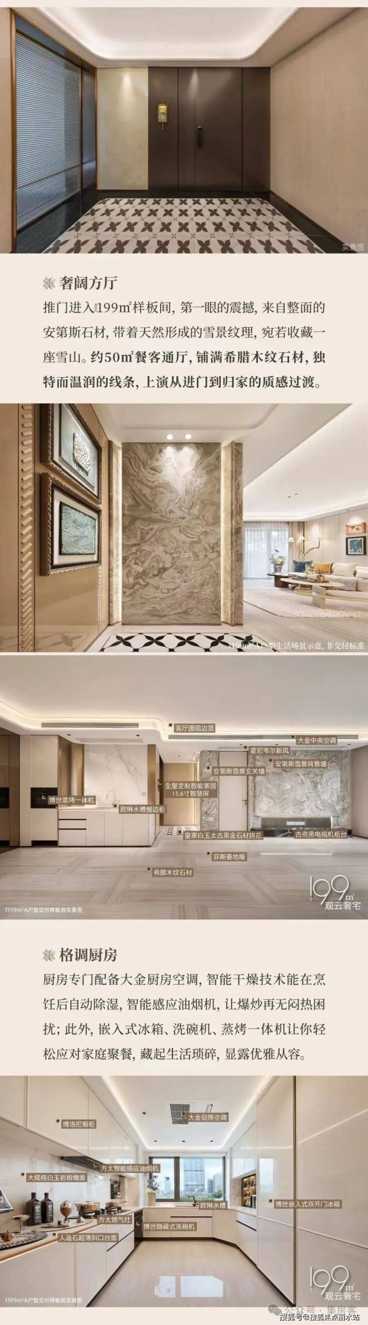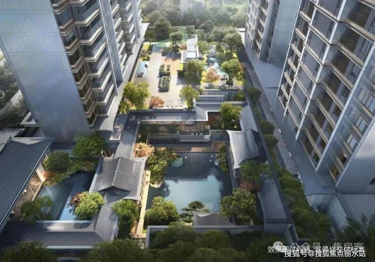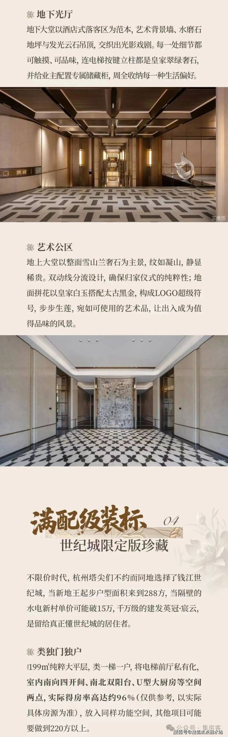 采用“王府中式”设计,大门为歇山顶形制(宽53米、高近11米),配黄铜狮、罗汉松及蓝翡翠奢石。园林融入西湖十景元素,如“花港观鱼”水景、“柳浪闻莺”绿植,并设雾森系统首层单元门厅石材铺就,肌理沉稳。