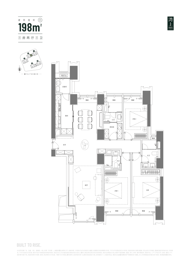 三开间朝南,标准动静分离户型,进门十字中轴,南北通透,客餐厅有足够长的纵深,极大提高了生活舒适感。主卧和次卧双套房设计,室内5飘窗1阳台,更增加了198户型的空间延展度。未来还可以根据家庭结构的变化,自行改造室内空间布局。