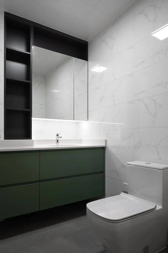 卫生间以哑光灰色地面+雅白墙面砖的组合,装上一个绿色的浴室柜,上方镜柜加入黑色收纳格,也提供了灵活方便的卫浴收纳与空间设计。