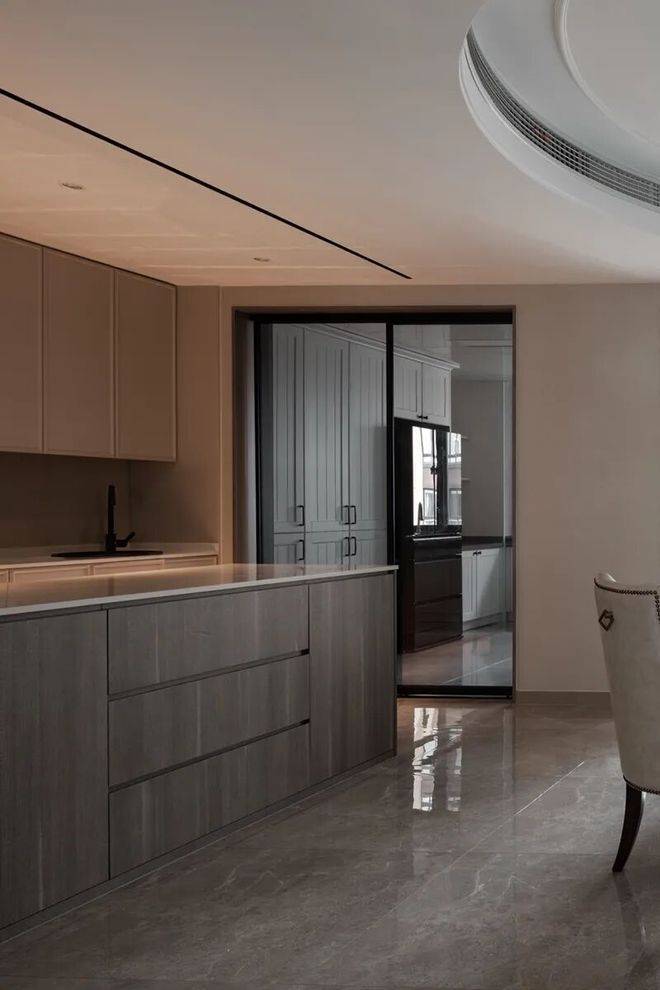 餐厅后方的中岛操作台,台面下方是深灰木色的柜体,为主人提供了一个别样情趣的西厨操作区域。