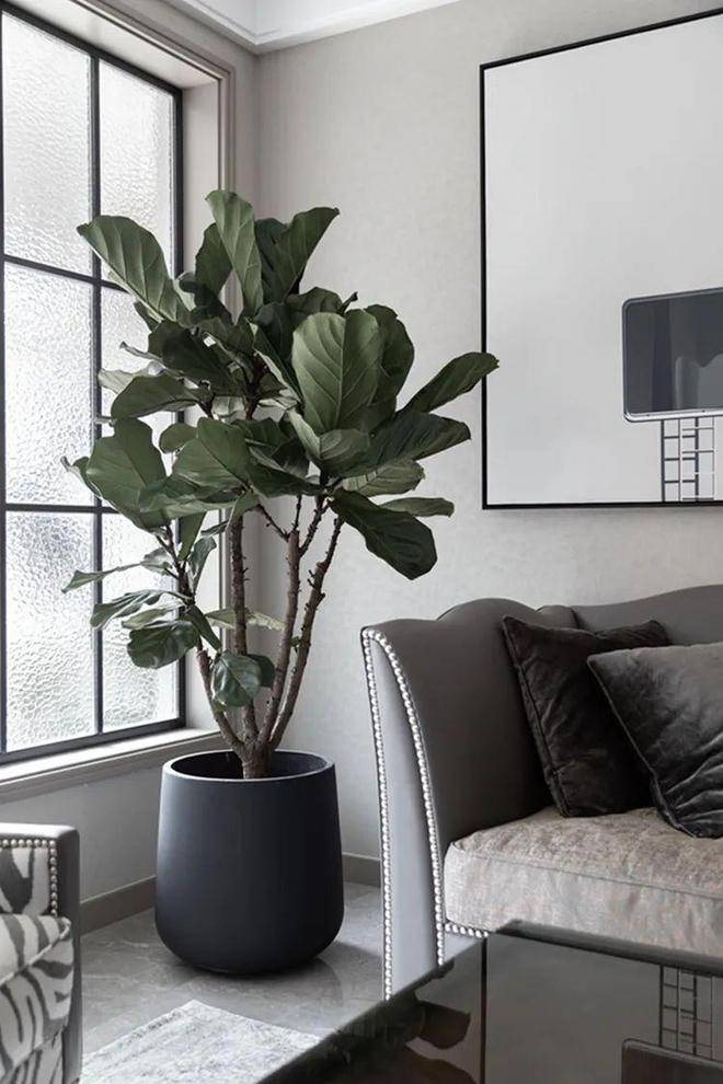 灰色的皮沙发,角落摆上一盆琴叶榕,在优雅舒适的空间下,带来一种清新文艺的端庄气质。
