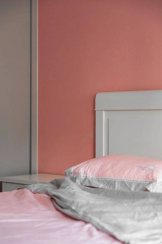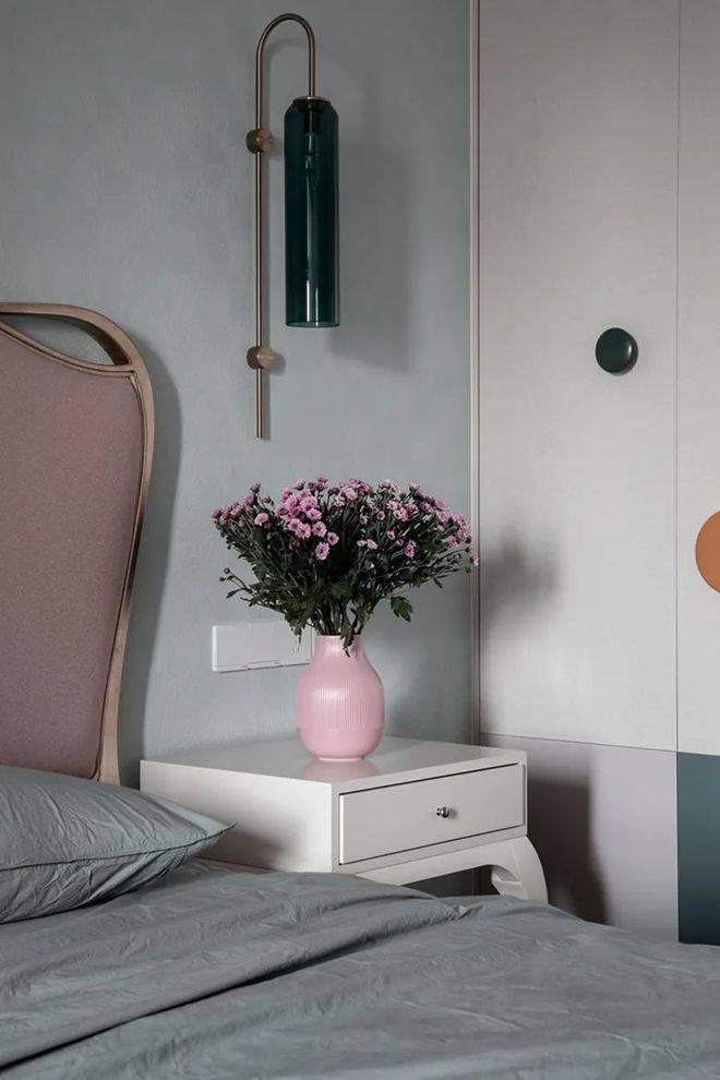 脏灰色的墙布墙布,结合色彩丰富的衣柜门与拉手设计,布置暗粉色的床铺,床头柜上粉色花瓶布置,后方一盏金属壁灯,也让卧室空间显得情趣优雅而温馨。