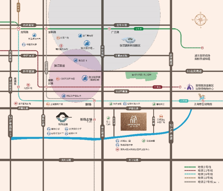 项目周边除二轨三高速外,地面路网也是极其便利的,申江南路、康新公路、沪南公路等可畅通抵达区域内其他板块。沪南公路由北蔡进入周康、航头、新场至惠南镇东门,可以说是整个大浦东的黄金走廊;双向六车道的申江路主干道,连接外环和中环,往北经过周康板块30分钟左右可直达张江。