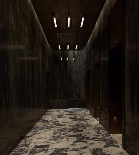 湾上采用地上+地下三层同标准精装入户大堂,大堂选用有着媲美艺术品表现力的亚马逊绿天然奢石,而且地上地下一脉相承、华贵一致,结合仿古铜不锈钢、艺术壁灯为点缀,将上海的摩登气息注入归家大堂,给业主更强烈的入户仪式感。