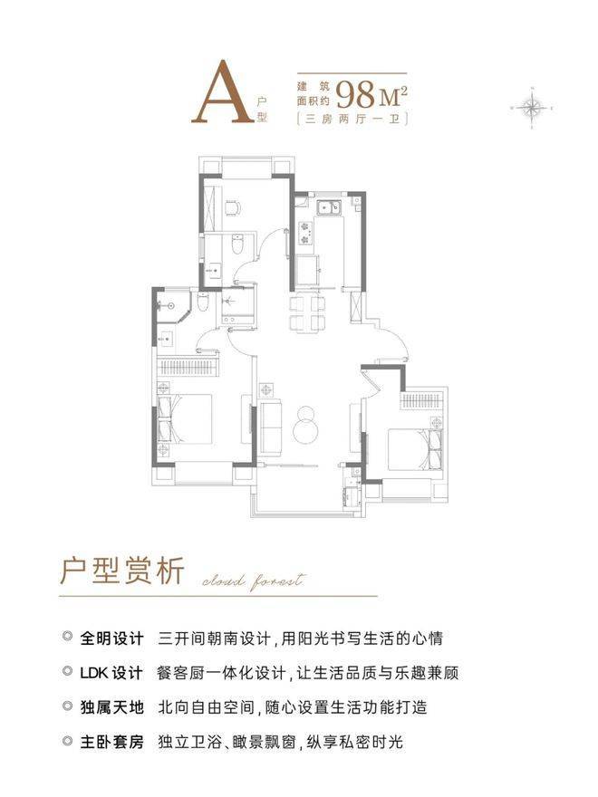 建面约98㎡3房:可以说这款户型满足了市场对刚需、刚改入门面积的所有需求,经典的三开间朝南飞机户型设计,最大化利用空间,减少面积浪费,整体格局方正南北通透。