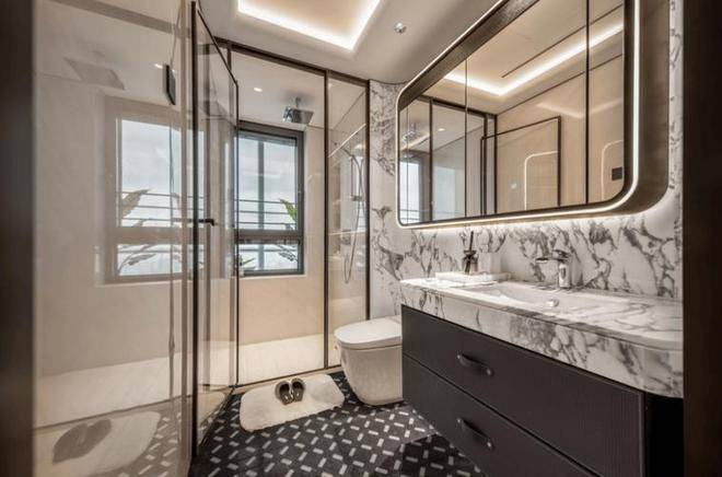 ✔卫生间地面和墙面整体性也非常强,奢石台面的纹路和岩板墙面和协调。
