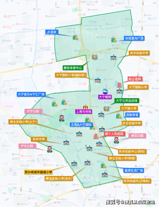 在原来的老闸北工业厂房拆迁后,大宁其实是从成片的空地整体规划开发,所以大家可以看到,这个区域是一个由中产豪宅+学区+交通+密集生活配套组成的强区。