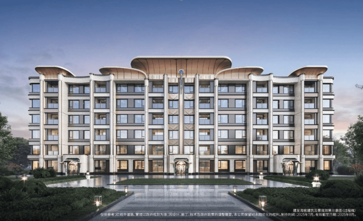 建发「宸系」中式作品,铝板与玻璃幕墙外立面,配园林景观。约1150套房源高低配,限高40米,含小高层、洋房、叠墅产品,满足刚需与改善需求。出入口古典园林五进景观体系,人车分流设计打造舒适归家体验。
