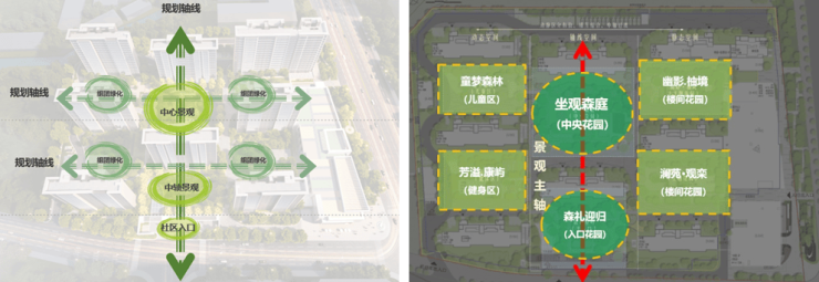 一轴是南北景观轴,包含入口花园和中央花园,动静区分有致,相互结合,将宅间花园分隔有序,在保证私密空间的条件下又通过中央花园相互连接。