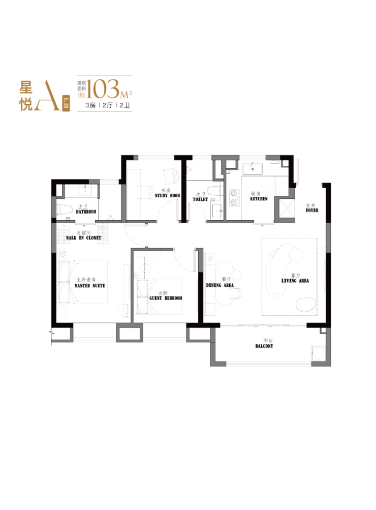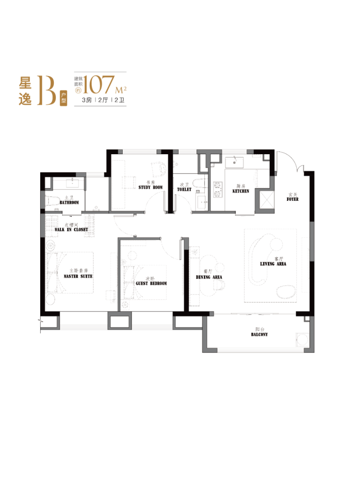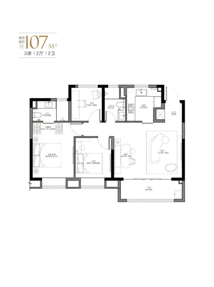 项目约103-107㎡3房2卫设计,有着 宽绰的大横厅设计,并且3.5开间朝南。