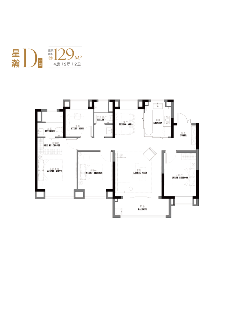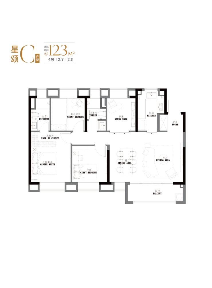 建面约123-129㎡真四房,这个户型的南向面宽和尺度感堪比一般的别墅。