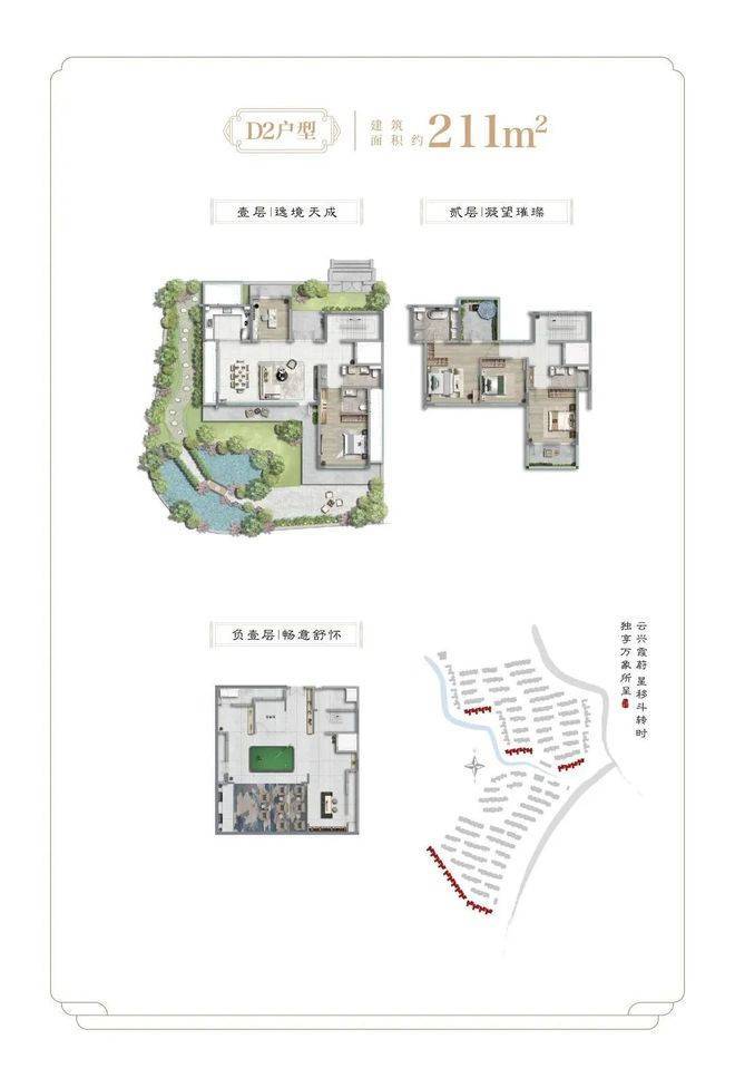 项目二期为纯别墅产品,社区容积率约0.41,面积段约为138-455㎡之间不等,不仅延续了一期多重景观结构,出市入室的仪式感满满,更是提升为围合式院落结构,增加了转角街巷之间的景观点,细节之处尽显大宅风范和业主的雍容气度。除常规的有天有地之外,还配有超高层高地下室及露台。