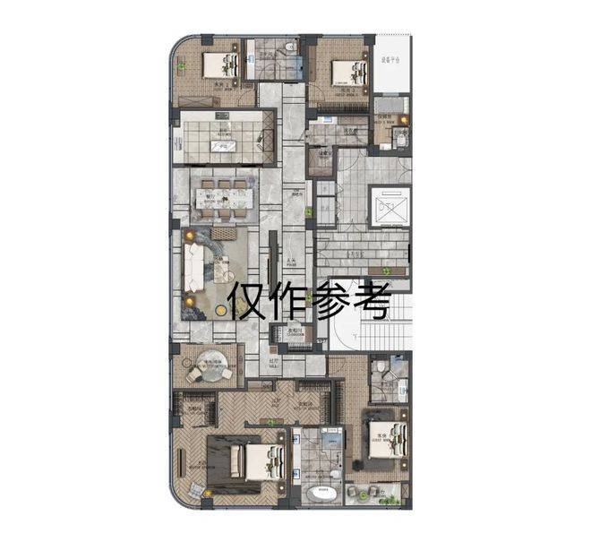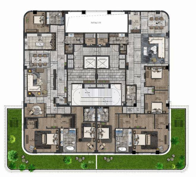 二楼带景观露台,顶楼空间则奢侈到夸张,490m²五房,一层一户送三个露台,比传统的300m²地上三层地下二层的别墅还舒服。因为别墅单层面积80m²,吃个饭楼上楼下跑,这里则是490m²摊在一个平面,因此这类顶楼大平层极度稀缺。