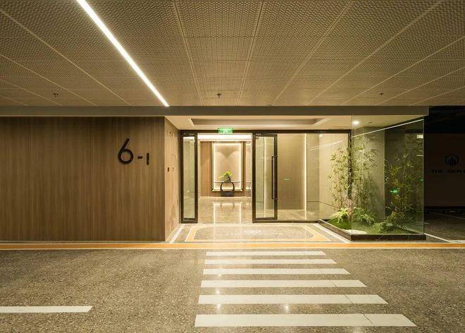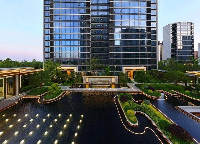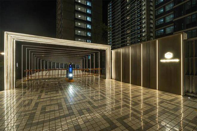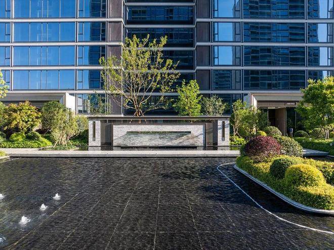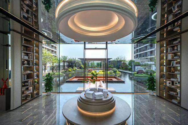 这座极具艺术感的入园大堂,采用巨大的铝板挑檐结合大面落地玻璃,搭配层层而下的水景喷泉,散发出浓郁的苏嘉美学。