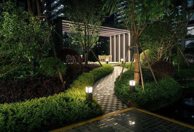 仔细看,所有花坛、连廊、景墙的边缘都置入了Led发光灯带,夜间也极富美感。