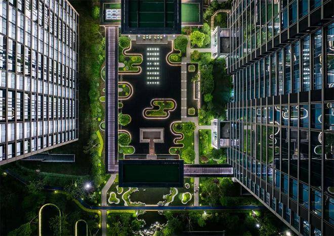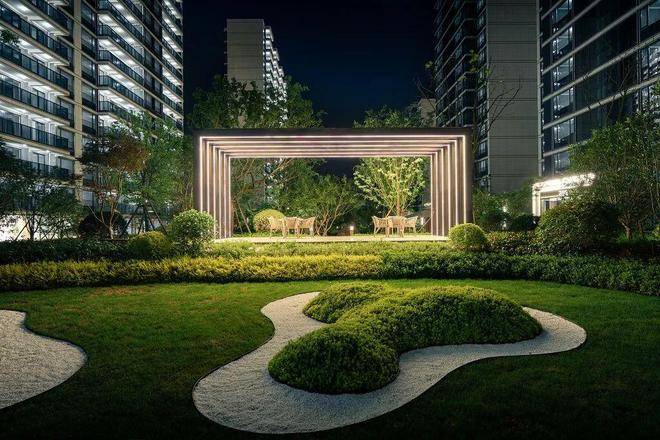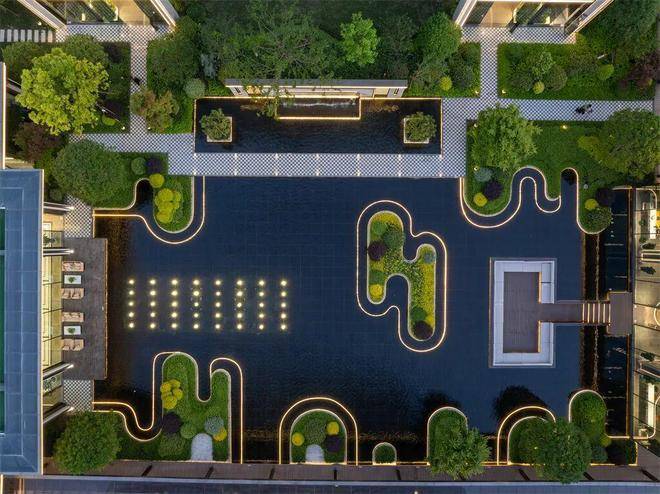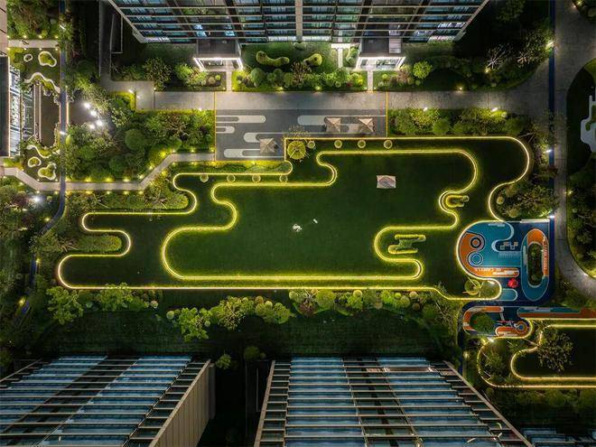 6000方的草坪,精心打造了“云纹”造型,还用了灯带修饰,轻盈流畅,独具美感,颇有“云境”氛围。