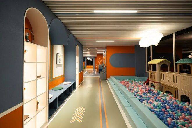 有专为小业主打造的童玩空间,配置色彩明艳的积木桌、攀岩墙、海洋球等等,全然一个家门口的遛娃胜地。