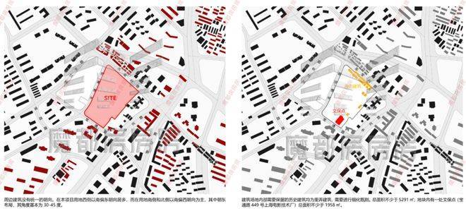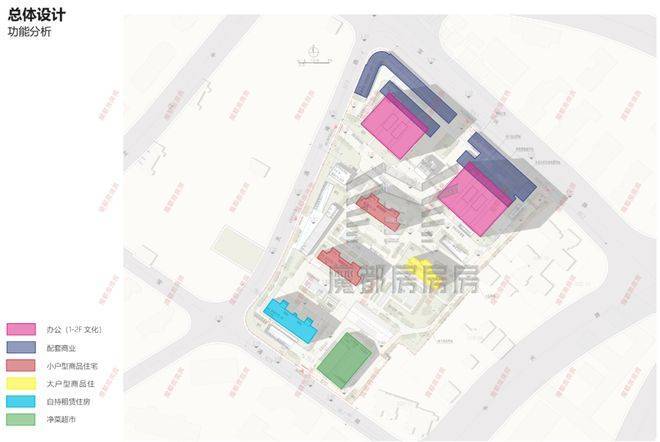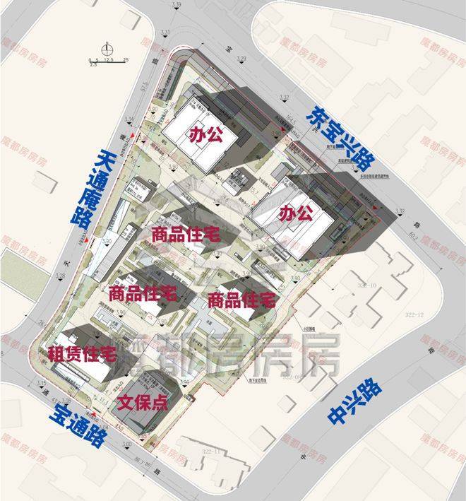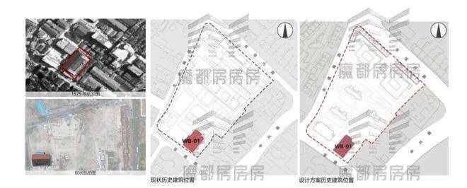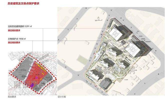 基地内需设置两栋办公楼、三栋商品住宅、一栋租赁住宅,此外基地内含5291平方米历史建筑,功能为配套商业及文化设施,含1958平方米文保点,功能为净菜超市及文化设置。