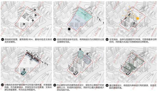 项目地块形状为不规则梯行,南北方向较长,将用地分成南北两部分,其中北侧布置商办组团及历史建筑,南侧布置住宅组团及综合配套(文保点)。