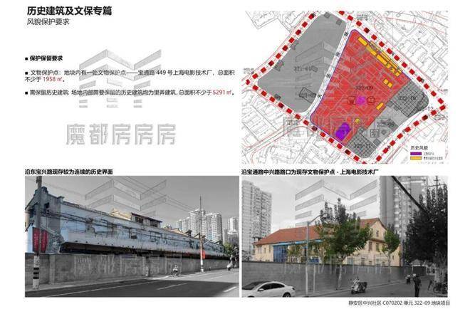 文物保护点:地块内有一处文物保护点——宝通路 449号上海电影技术厂,总面积不少于1958㎡。