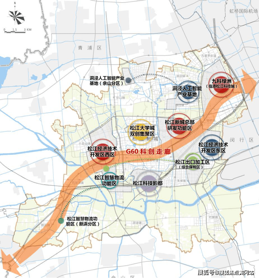 在上海科创版图中,松江G60科创走廊占据龙头位置,在G60高速两侧形成“一廊九区”的布局,集聚40多家世界500强,聚集了松江约90%的工业产值占上海工业产值近10%。