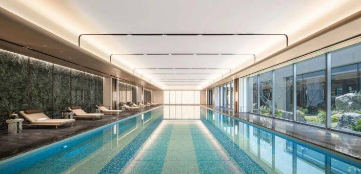 5️⃣漫游四季 酣畅舒放恒温泳池空间以“水”为设计灵感,用蓝色作为主色调,营造出水面一圈圈水纹渐渐散开的自由之意,,且无惧风雨四季皆可畅游
