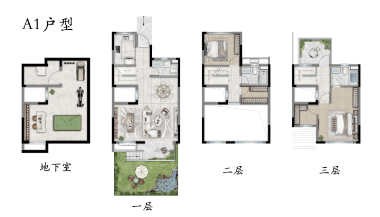 地上三层+地下一层设计,实现功能垂直分区: