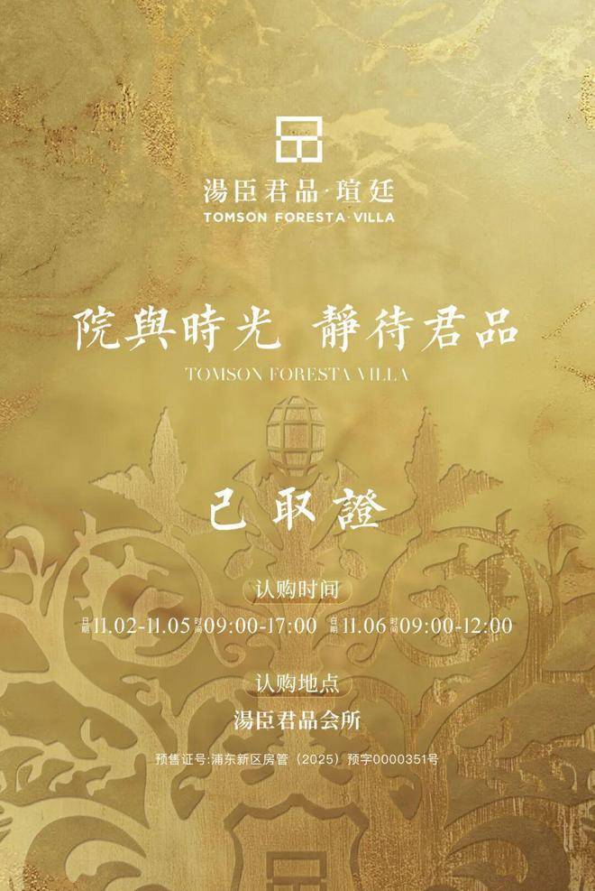 汤臣君品·瑄廷已取证,11月2日开启认购!推出49套建面约332-398㎡联排,均价19.68万/㎡