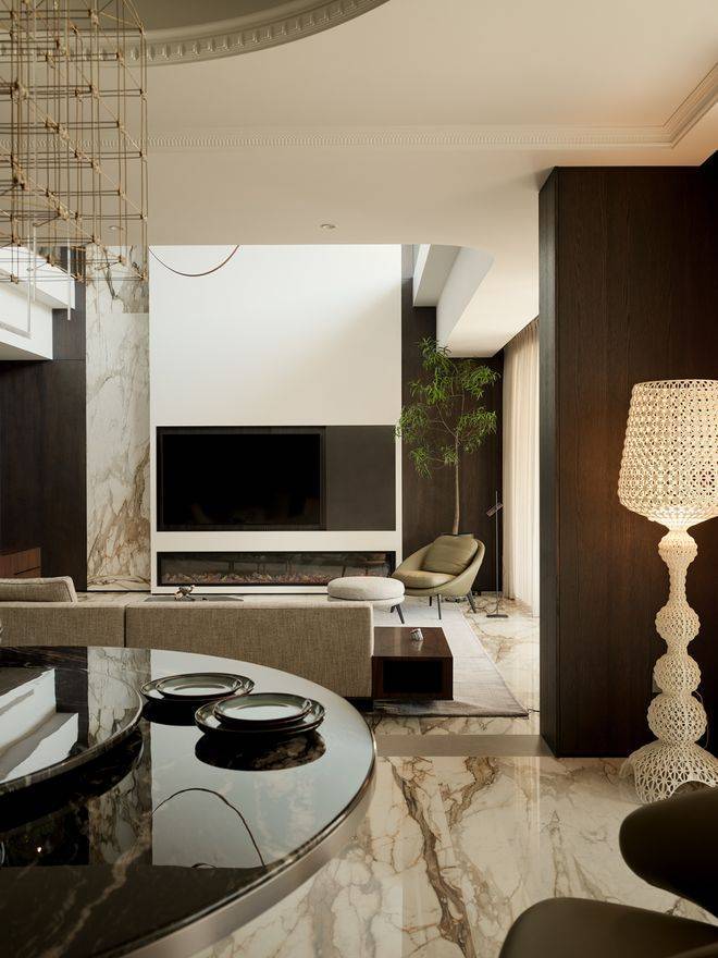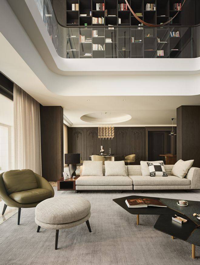 房子内部以“垂直生长”回应家族生命周期。一楼作为家庭社交中枢,6米多高的挑空客厅以卡拉卡塔金大理石纹为幕,石材纹理如水墨恣意流淌,灰色的手工地毯以“时光的褶皱”为精神内核,与Minotti的家具构成刚柔对话。