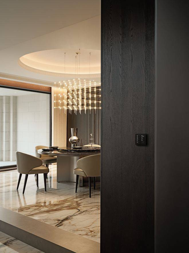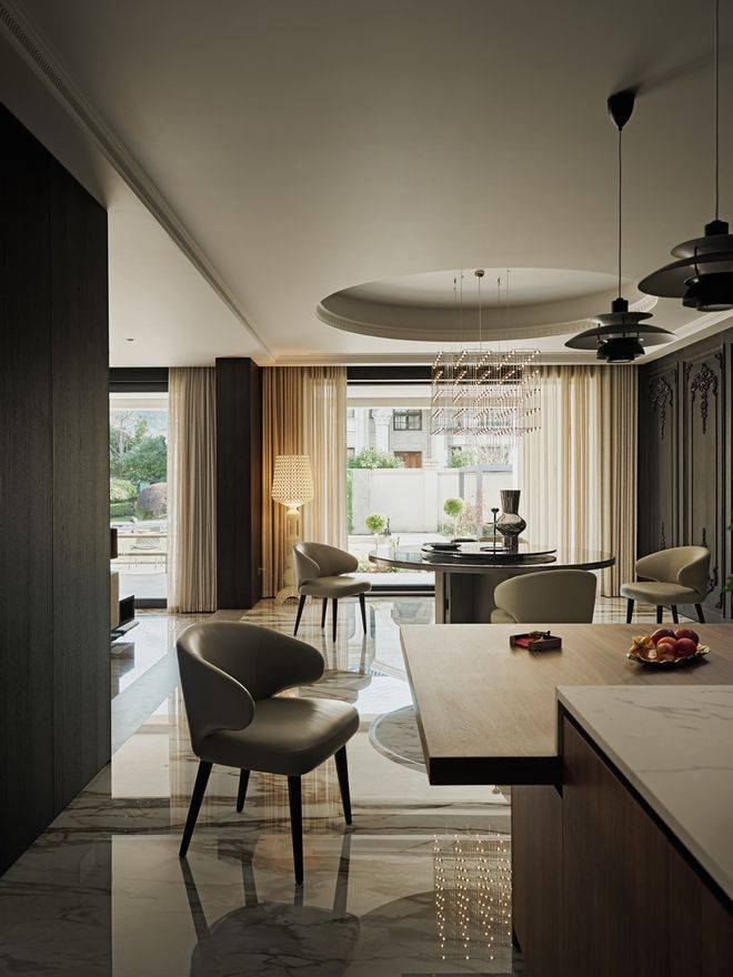 中西双厨选用Dada橱柜,岛台延伸作为早餐和休闲区,10人位的圆形餐桌,暗合东方“团圆”意象,落地窗将客厅、餐厅、茶室与南花园串联为流动的整体。
