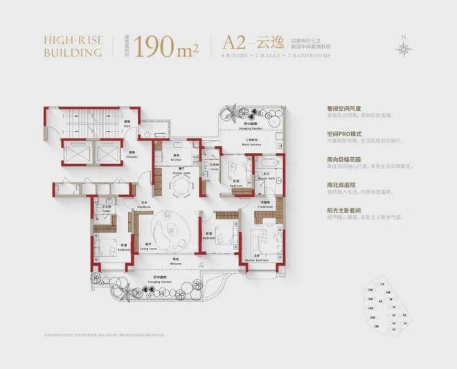 四开间朝南,南向面宽做到惊人的16.5米,并且南向阳台宽约9.2米,采光面相当充足。拥有南北两座空中庭院,仅赠送面积就达到了约33㎡。