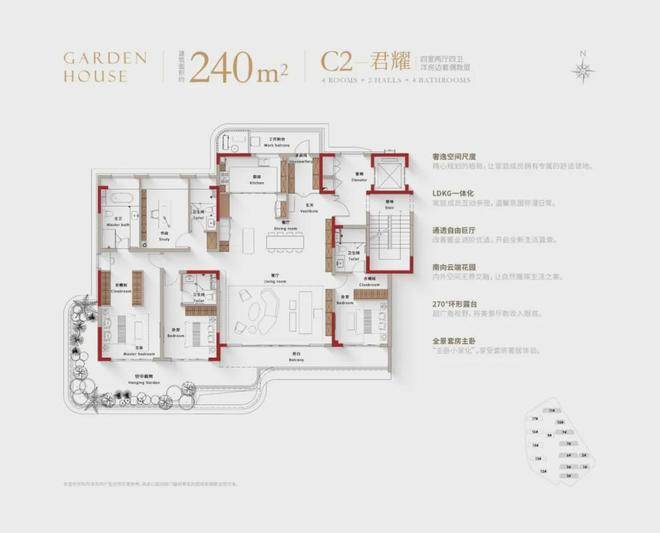 突破传统的餐客厅一体化设计,形成LDKBG一体化,从客厅步入庭院,感受阳光与绿意。南向奢享双套房,配备独立卫浴、预留衣帽间等,满足对品质生活的追求。