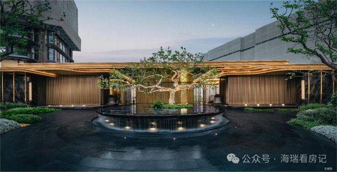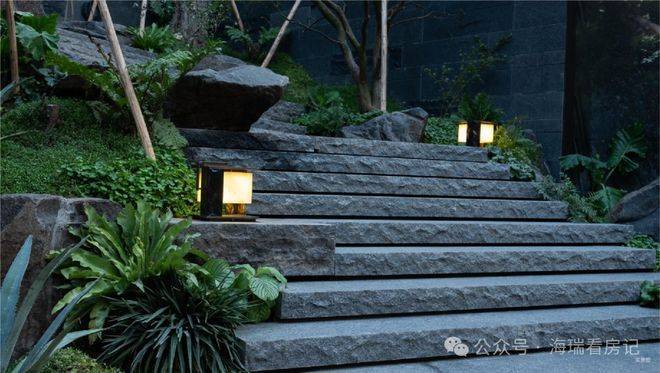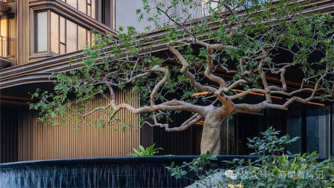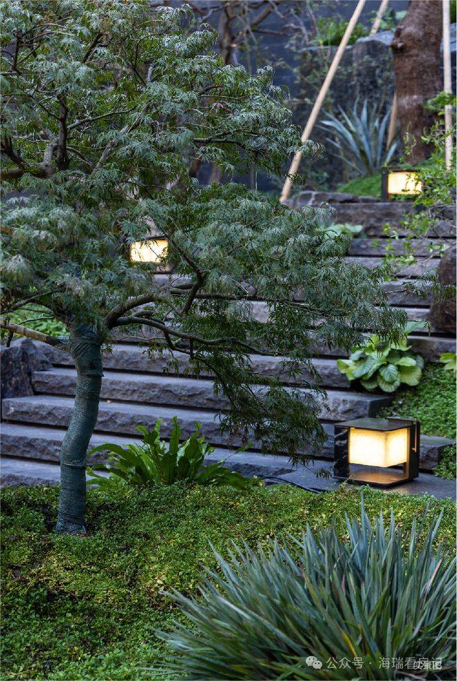 而实景首开的近2000㎡下沉庭院,作为“园林灵魂”,漫步此间,你会看见:乌金原石围合的“玉扣绿岛”上,低调静放着团队自“天下玉源”河南南阳历时遴选而来,近7000年的“国玉”独山璞玉,与山野林木共此氤氲灵气,尽显东方温润;从诗经走出来的近11m高参天乌桕,则再现古诗中所描述的“秋林城郭画图中,乌桕千株照眼红“的诗意;采用约6.7m幻影蓝奢石打造的“叠级水瀑”跌水台,池底以呈现天然墨绿色泽的蓝金刚石铺就,映水之澄明,境之悠远;连台阶都采用了“黑色花岗岩之王”安哥拉黑整石,沿云梯而上,让人返璞内心东方......