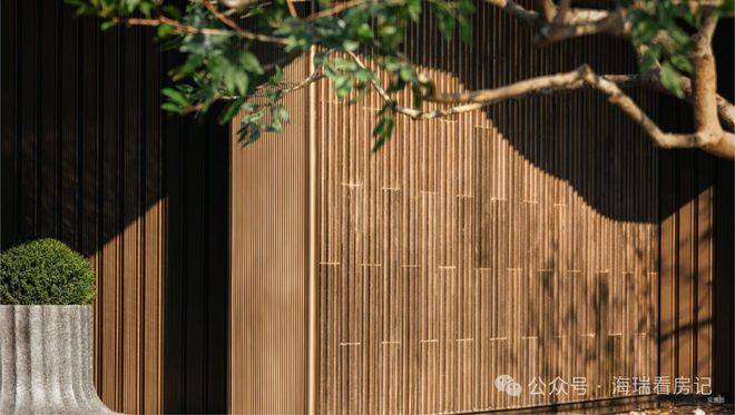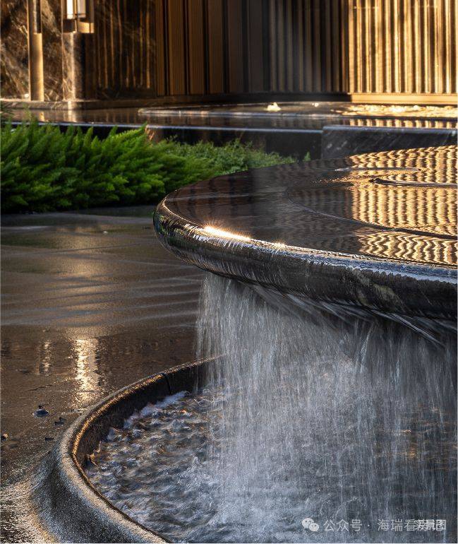 门庭隐现墨绿色泽的「璞熠琉璃」背景墙,经800℃高温淬炼,三十昼夜退火降温,无数遍打磨抛光,光影流转间熠熠生辉;特邀非遗传承人、福记世家第五代传承人夏志平,用十指抟砂古老手工艺独家定制的「璞釉艺陶」,搭配金属釉质感窑花纹理点缀,尽显温润高级。背后为呈现世间至美陶色,一片陶更历经了百次淬炼,配方调整,1280℃高温均匀铺釉。7.5m冠幅的百万级「百年冬青」,乃团队跨越6省17城,百次实地勘察,从近万棵名木中,万里挑一甄选而出,枝干苍劲充满力量;水盘池底的「流金银河」奢石,浓缩着来自宇宙的浪漫,以水刀行纹,让东方的银河让自上而下,层层倾泻。