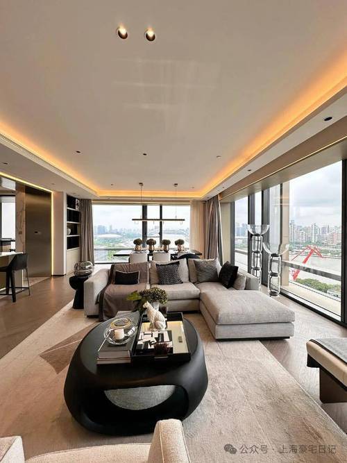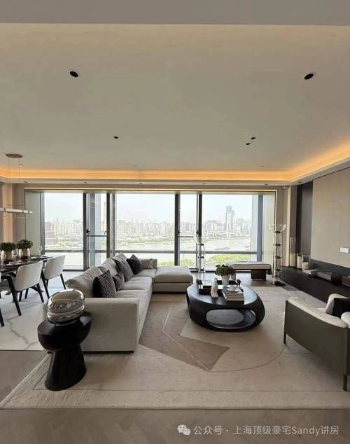 这客厅既是270°全景舱厅,无论全家在餐桌前欢聚一堂,还是孩子们在客厅嬉戏,一抬头便是以江景和城市为主题的巨幅油画。