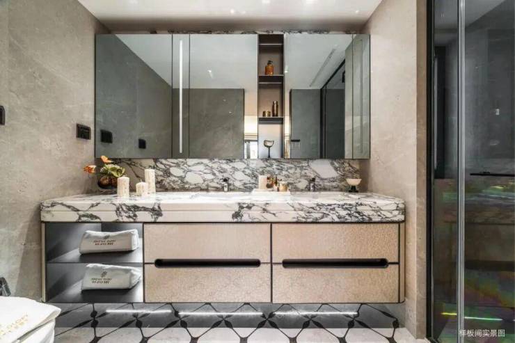 此外,室内装标同频半亿级豪宅(指单套总价半亿,下同)标准,配备嘉格纳六件套厨电(含油烟机、灶具、蒸烤一体机、洗碗机及双开门冰箱)、劳芬双台盆/三折叠美妆镜柜组成的行政套房级主卫系统,并搭载华为全屋智能控制系统。