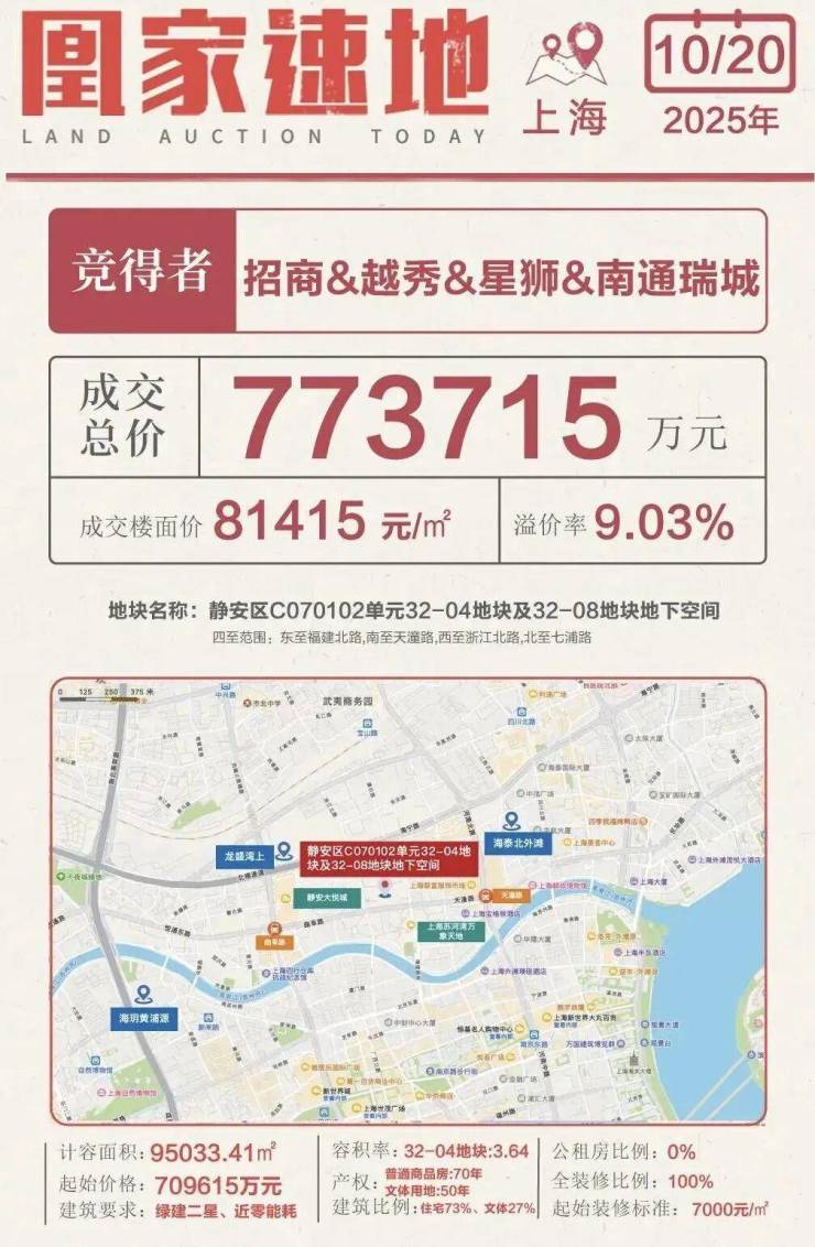 土地市场作为房地产的先行指标,直接反映区域的发展预期。2025年第八批次土拍中,苏河湾北岸地块吸引3家实力竞买人参与,经过52轮激烈竞价,最终由招商、越秀、星狮、南通瑞城组成的联合体,以11.8万元/㎡的楼板价成交,溢价率9.03%,预示着未来新房售价将指向20万元/㎡+。