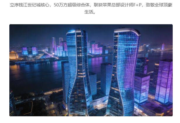建筑群:7栋最高约200米的建筑,涵盖写字楼、大平层住宅、商业街区等。